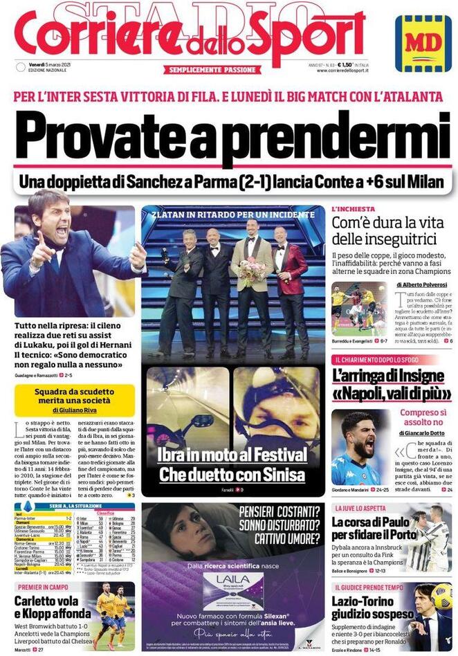 Sulle prime pagine dei quotidiani sportivi in edicola oggi si parla dell’Inter che, dopo il successo sul Parma, ha allungato a +6 in classifica; si parla di Ibrahimovic a Sanremo; di Arthur, De Ligt e Cuadrado che tornano dall’infortunio e anche del ricorso che il Torino farà in merito alla sfida contro la Lazio.