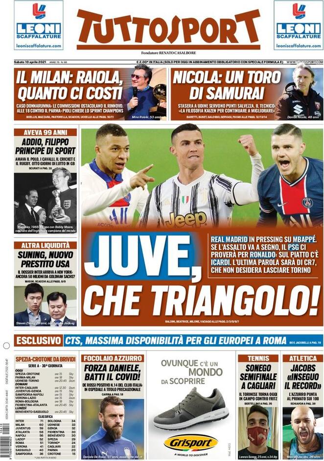 Di seguito le prime pagine di Gazzetta dello Sport, Corriere dello Sport e Tuttosport: