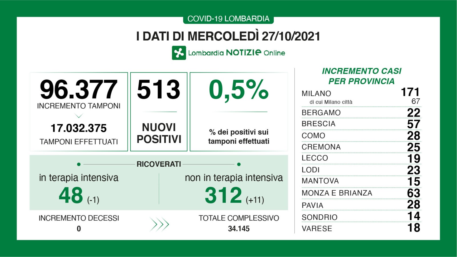 Sono 513 i casi di coronavirus in Lombardia nel bollettino giornaliero della Regione. Si tratta dello 0,5% degli oltre 96mila tamponi effettuati tra ieri e oggi. Non si registra nessun decesso, dato in controtendenza col bollettino dei contagi; nei reparti ospedalieri -1 terapia intensiva e +11 ricoveri ordinari. A Brescia e provincia i nuovi casi sono 57.