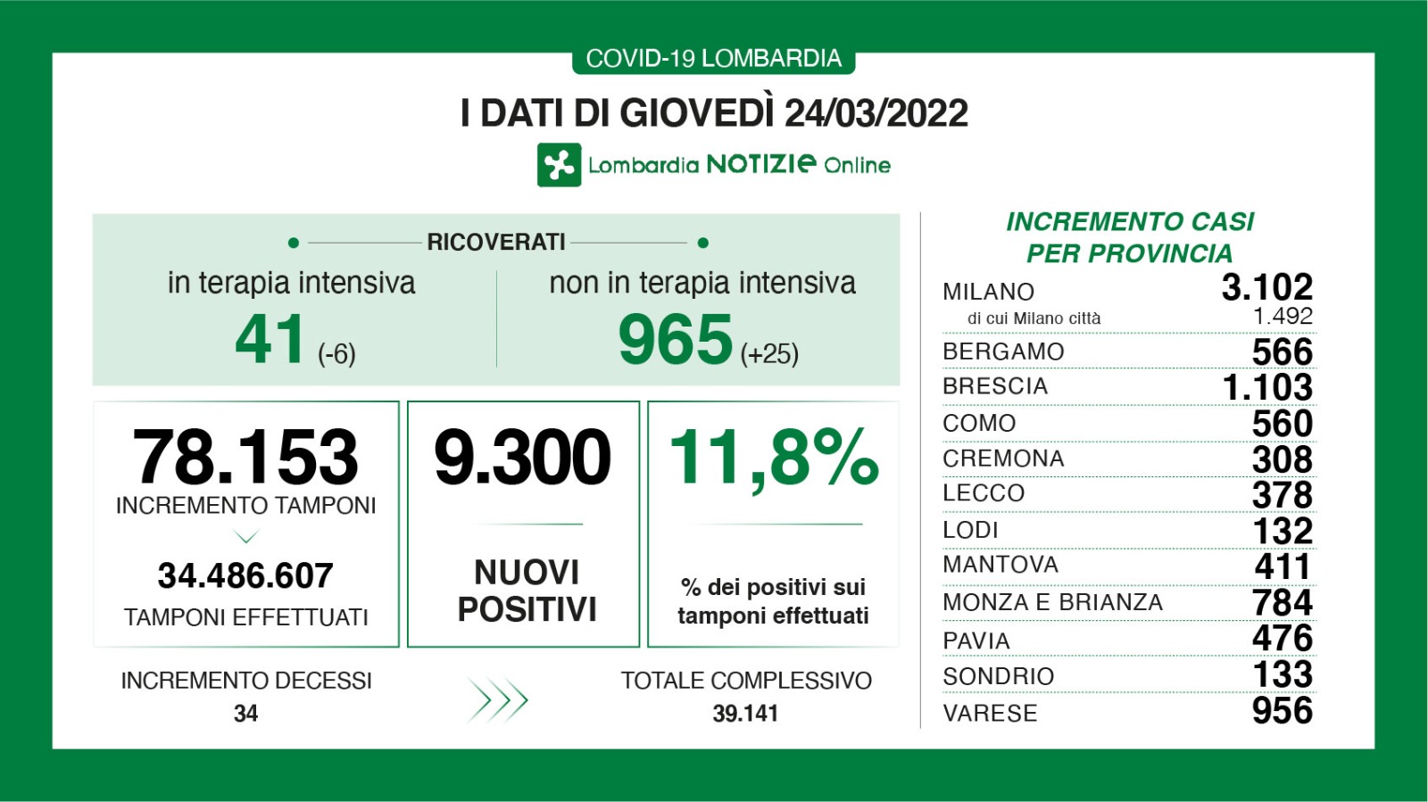 Calano ancora le terapie intensive (41, -6) occupate in Lombardia nel bollettino di oggi sui contagi da Covid. In tutto sono 9300 i nuovi casi in regione, di cui 1103 nel bresciano: percentuale di positivi in leggero calo all’11,8% mentre salgono i ricoveri ordinari (+25).