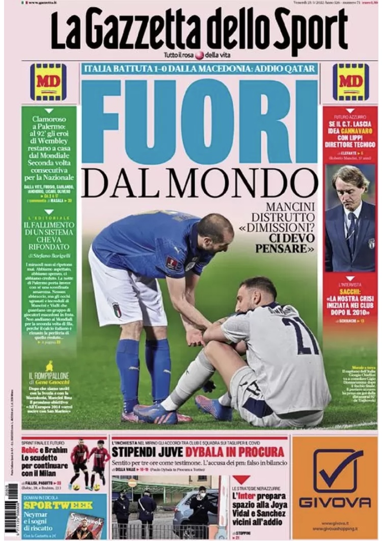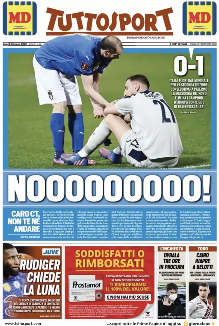 Il clamoroso 0-1 di Palermo che condanna l’Italia al secondo mondiale consecutivo a casa – dopo i due precedenti chiusi con la fase a gironi – ovviamente riempie tutte le prime pagine dei quotidiani, anche per l’assenza della Serie A nel fine settimana. La Macedonia si giocherà una storica qualificazione in Qatar in casa del Portogallo.