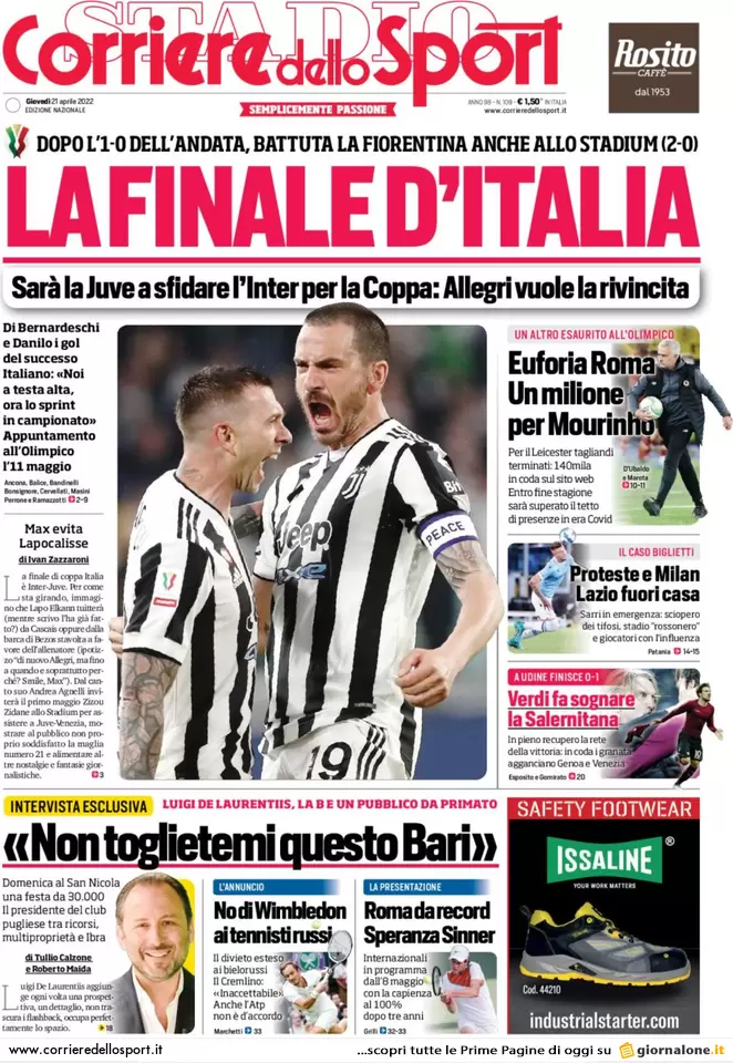 I quotidiani sportivi in edicola oggi si concentrano sulla Coppa Italia che in finale vedrà la sfida tra Inter e Juventus. Spazio poi al Milan, alla Formula 1, al tennis e al ciclismo.