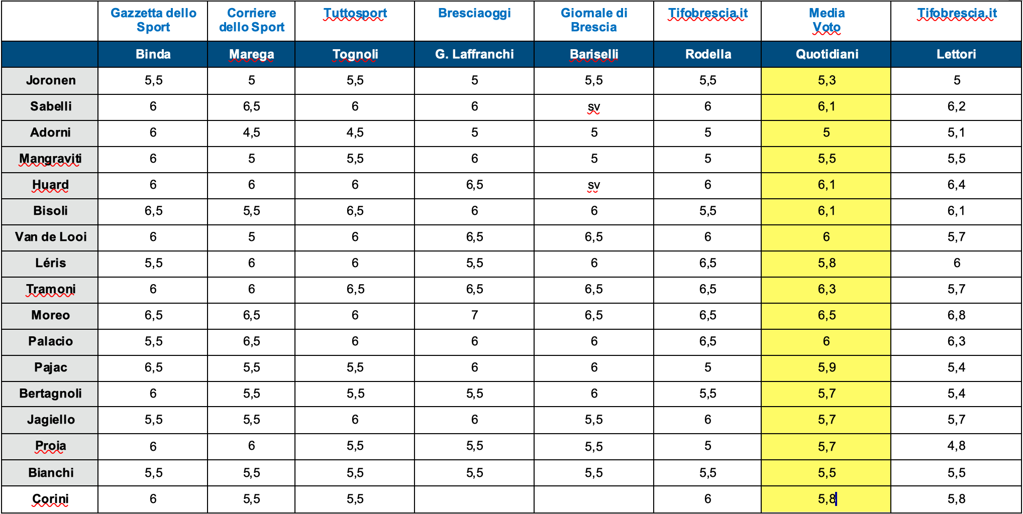 Differenze ridotte tra stampa e media voto dei lettori al termine di Brescia-Monza: in qualche caso è più ampio lo scarto tra i singoli giornali (Mangraviti e van de Looi) mentre si osservano medie molto diverse solo per Proia (5.7 contro il 4.8 dei lettori) e Tramoni (6.3 contro 5.7). In ben sette casi le due medie coincidono, o variano al massimo di 1 decimale.