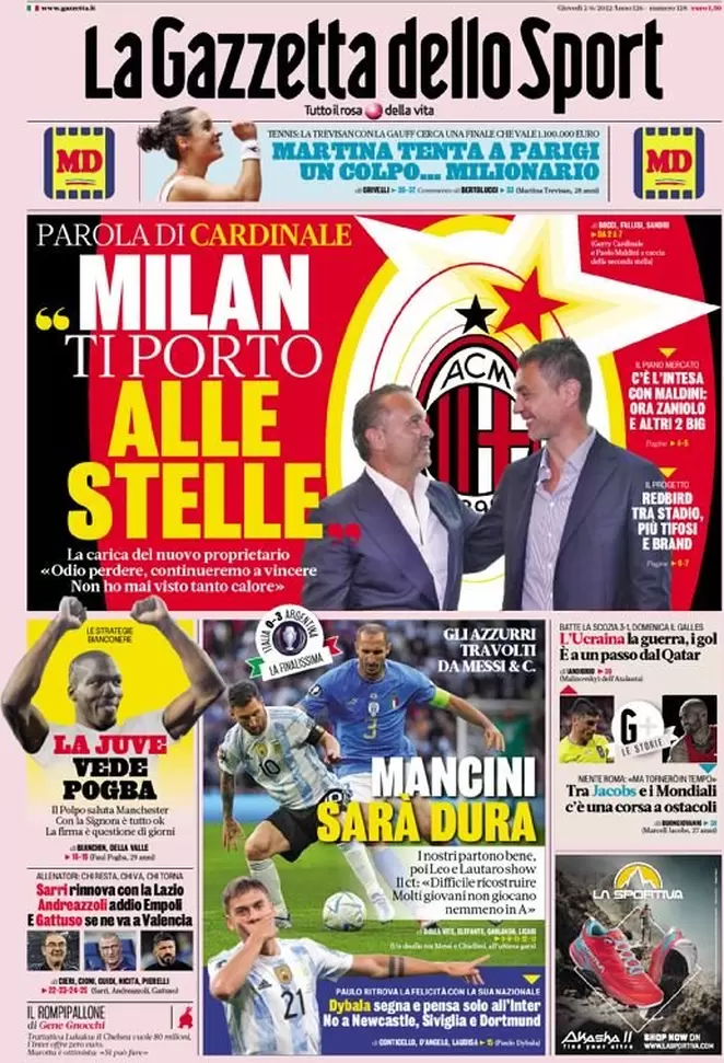 Altra delusione dal calcio giocato per la Nazionale che dopo l’eliminazione da Qatar 2022 perde la “finalissima” con i campioni sudamericani dell’Argentina. Ma sui giornali sportivi di oggi trovano posto anche il passaggio di proprietà del Milan e il possibile secondo ritorno di Paul Pogba alla Juventus.