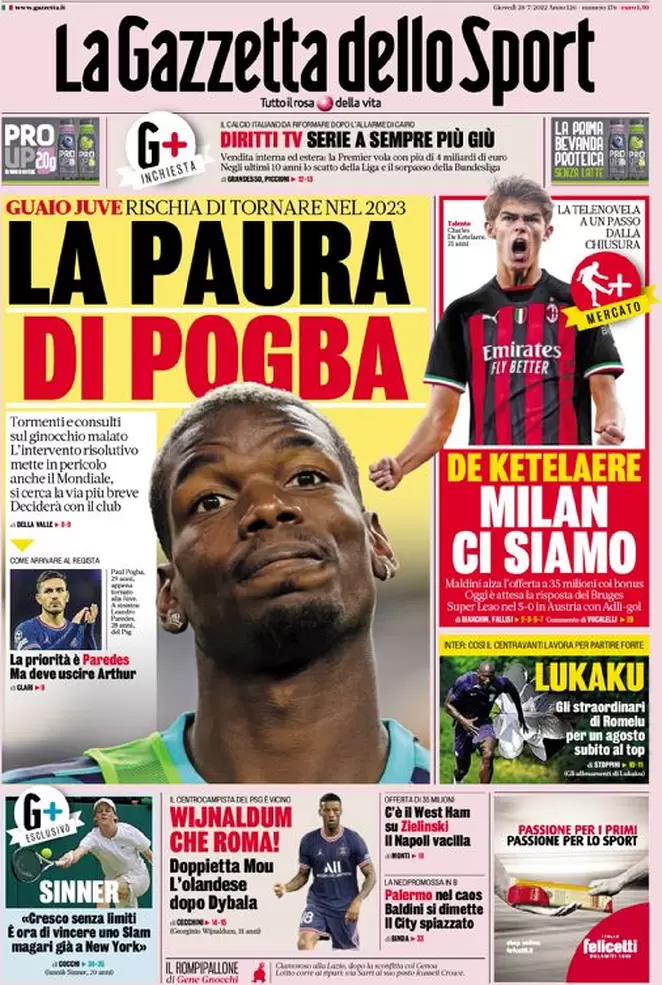 Ecco le prime pagine di Gazzetta dello Sport, Corriere dello Sport e Tuttosport in edicola oggi, giovedƬ 28 luglio