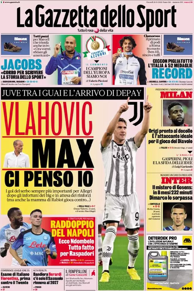Ecco le prime pagine di Gazzetta dello Sport, Corriere dello Sport e Tuttosport in edicola oggi, giovedƬ 18 agosto.