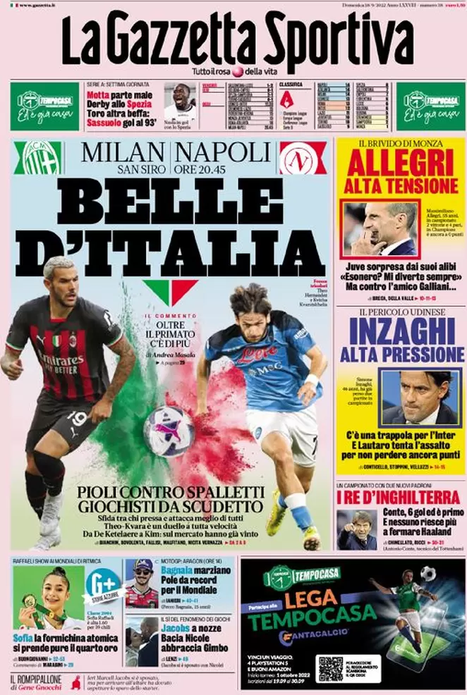 Di seguito le prime pagine di Gazzetta dello Sport, Corriere dello Sport e Tuttosport in edicola oggi, domenica 18 settembre.