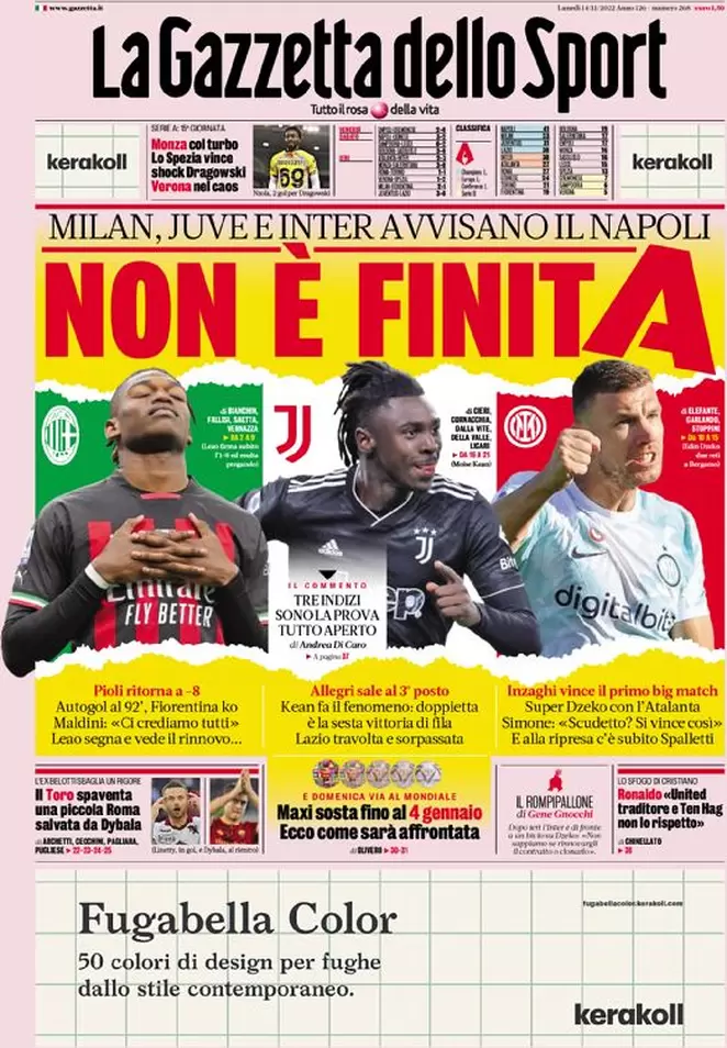 Di seguito le prime pagine di Gazzetta dello Sport, Corriere dello Sport e Tuttosport in edicola oggi, lunedƬ 14 novembre.