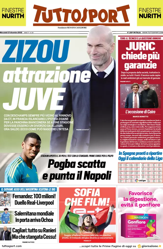 Di seguito le prime pagine di Gazzetta dello Sport, Corriere dello Sport e Tuttosport in edicola oggi, mercoledì 21 dicembre.