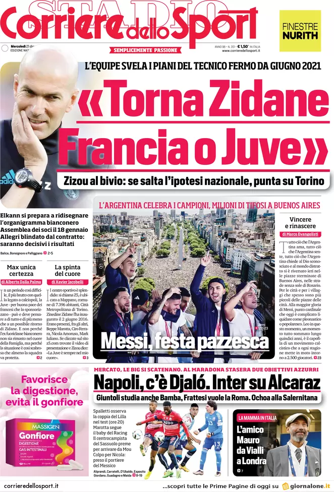 Di seguito le prime pagine di Gazzetta dello Sport, Corriere dello Sport e Tuttosport in edicola oggi, mercoledì 21 dicembre.