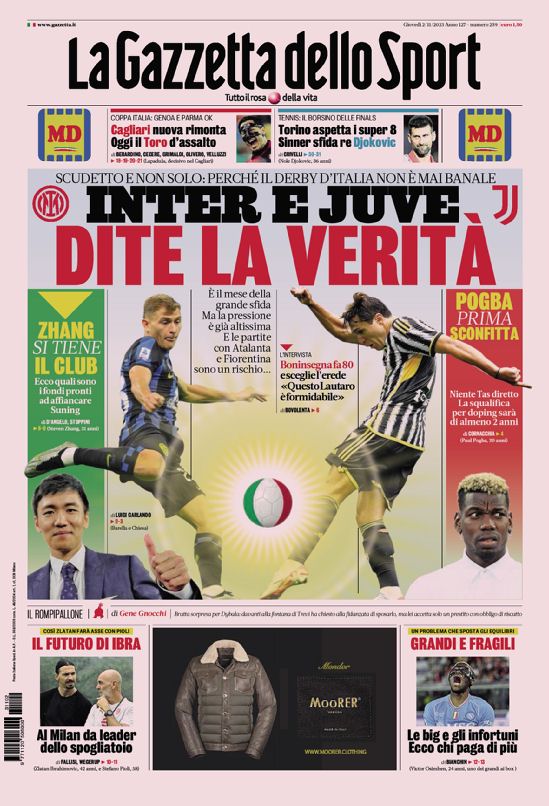 Le prime pagine dei quotidiani sportivi di oggi, giovedƬ 2 novembre...
