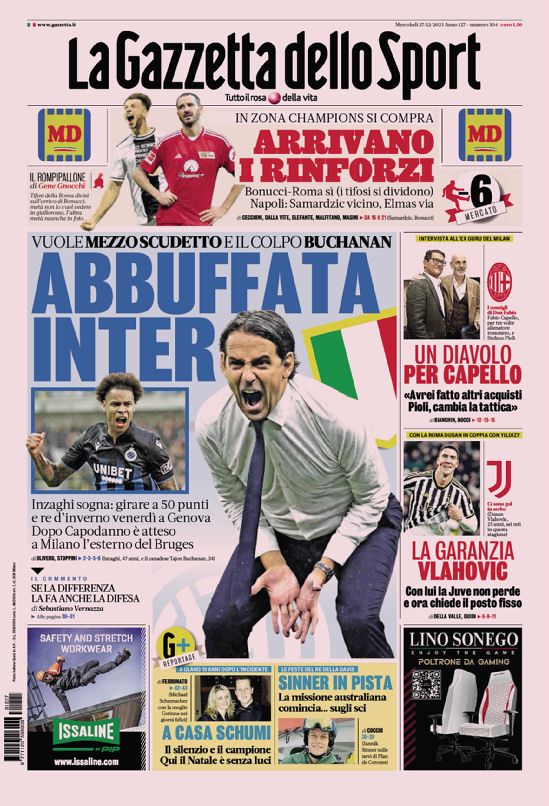 Le prime pagine dei quotidiani sportivi di oggi, mercoledƬ 27 dicembre...
