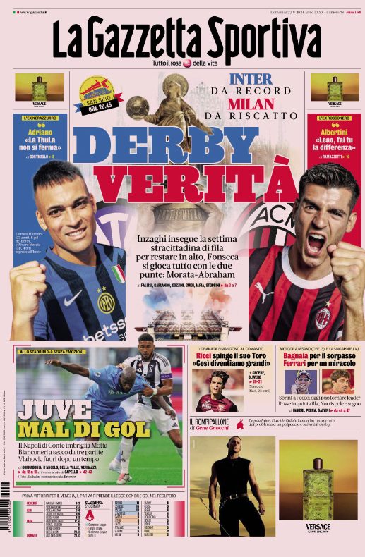 Le prime pagine dei quotidiani sportivi di oggi, domenica 22 settembre...