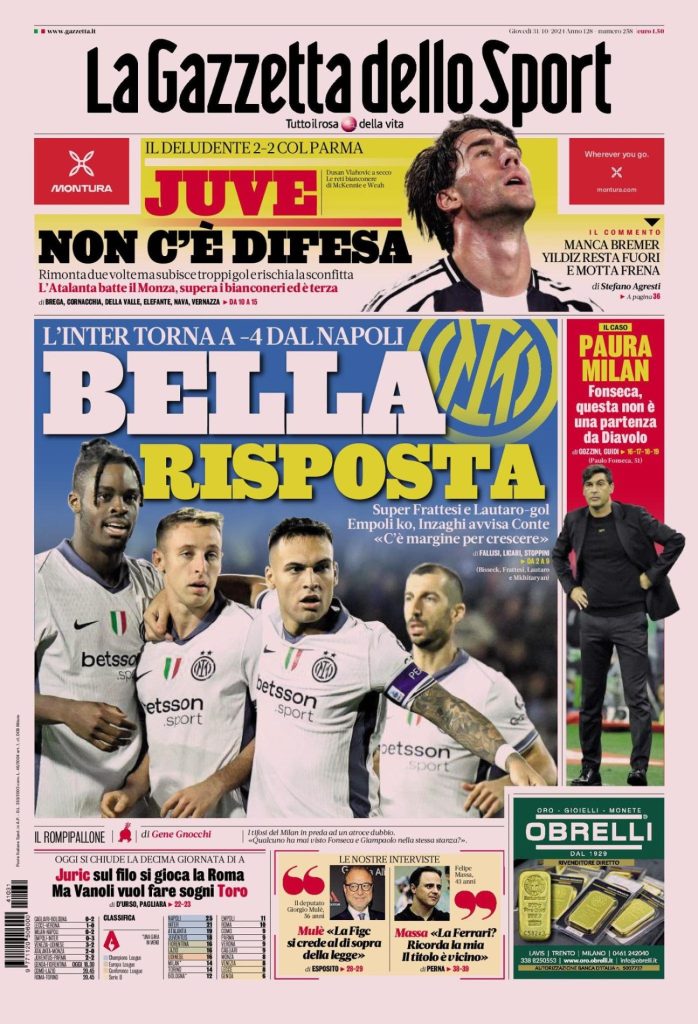Le prime pagine dei quotidiani sportivi di oggi, giovedƬ 31 ottobre...