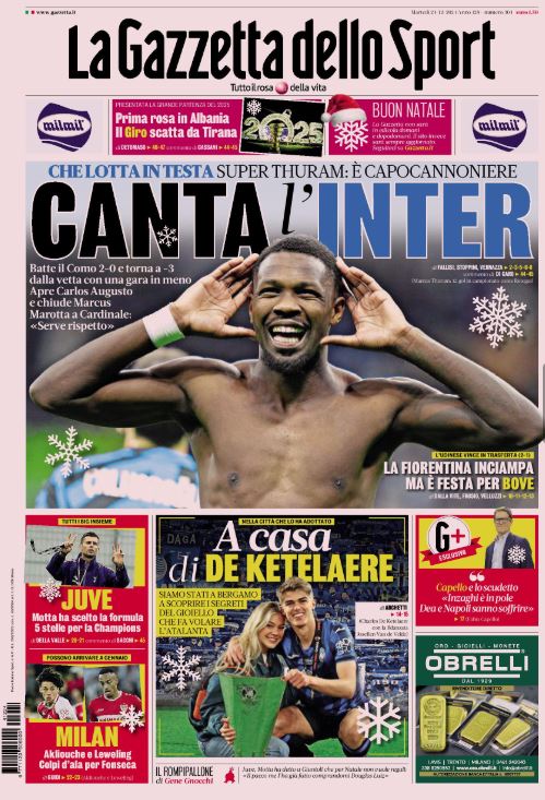 Le prime pagine dei quotidiani sportivi di oggi, martedƬ 24 dicembre...